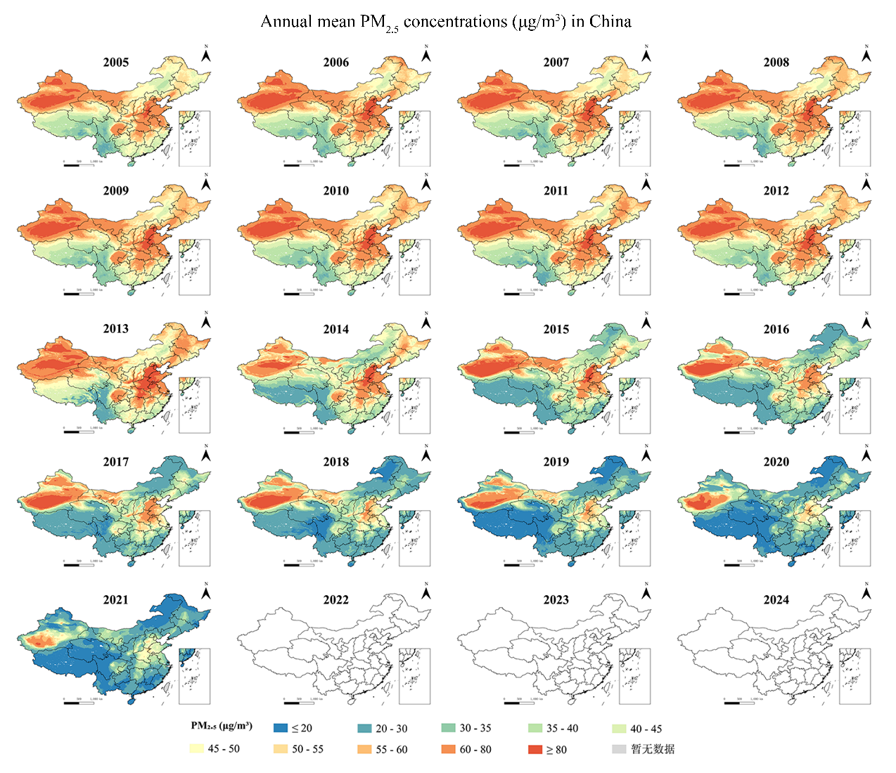 2005-2021年中国区域每日PM2.5浓度数据的空间分辨率为1km × 1km,单位为µg/m3。该数据基于机器学习算法中的随机森林模型预测得到,模型构建使用的预测变量包括大气校正气溶胶光学厚度(MAIAC AOD)、化学传输模式模拟的大气PM2.5浓度、气象参数、海拔高度和人口密度等多源数据。由于AOD季节性非随机缺失率较高,本数据已对卫星数据缺失引起的PM2.5预测数据缺失进行了补缺处理,因此得到的PM2.5日平均浓度实现了时空全覆盖。PM2.5地面测量值和随机森林模型预测值在日水平的总体十折交叉验证R2 和均方根误差 (RMSE) 分别为0.86和14.46 μg/m3。1km × 1km分辨率的月均、年均PM2.5浓度由日均PM2.5浓度平均而来。该数据集持续更新,数据需求请发邮件联系作者(孟夏,[email protected])。