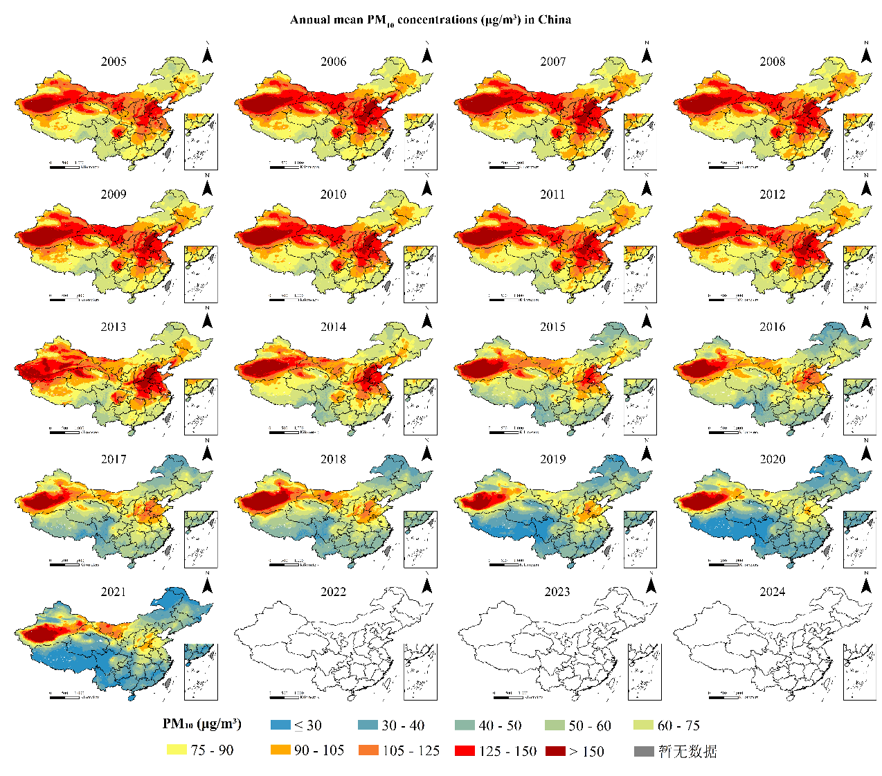 2005-2021年中国区域每日PM10浓度数据的空间分辨率为1km × 1km,单位为µg/m3。该数据基于机器学习算法中的随机森林模型预测得到,模型构建使用的预测变量包括大气校正气溶胶光学厚度(MAIAC AOD)、化学传输模式模拟的大气PM10浓度、气象参数、海拔高度和人口密度等多源数据。数据同样已经针对卫星数据缺失进行了补缺处理,可达到时空全覆盖。PM10地面测量值和随机森林模型预测值在日水平的总体十折交叉验证R2 和均方根误差 (RMSE) 分别为0.88和20.92 μg/m3。1km × 1km分辨率的月均、年均PM10浓度由日均PM10浓度平均而来。注意:该数据集持续更新,数据需求请发邮件联系作者(孟夏,[email protected])。