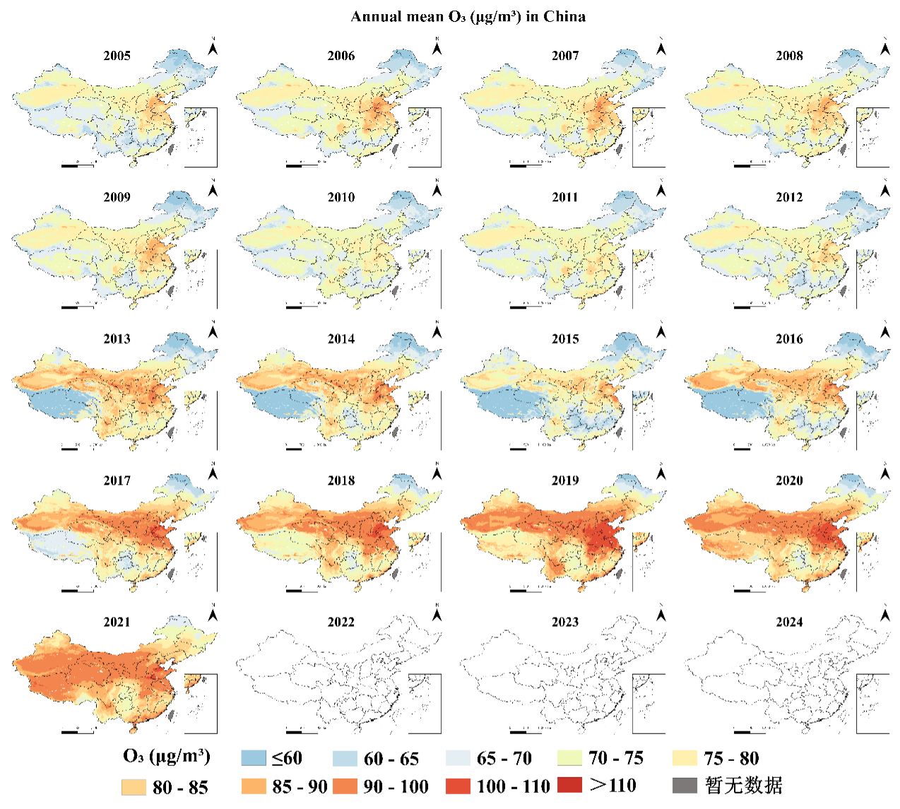 2005-2021年中国区域O3每日最大8小时平均(maximum daily 8-h average, MDA8)浓度由随机森林算法反演得到,数据集的空间分辨率为1km × 1km,单位为µg/m3。该数据库基于机器学习算法中的随机森林模型预测得到。模型构建使用的预测变量包括化学传输模式模拟的大气O3每日最大8小时平均浓度、气象参数、能见度、路网、海拔高度和人口密度等多源数据。O3地面测量值和随机森林模型预测值在日水平的总体十折交叉验证R2 和均方根误差 (RMSE) 分别为0.91和9.22 μg/m3。1km × 1km分辨率的月均、年均O3浓度由日均O3浓度平均而来。注意:该数据集持续更新,数据需求请发邮件联系作者(孟夏,[email protected])。