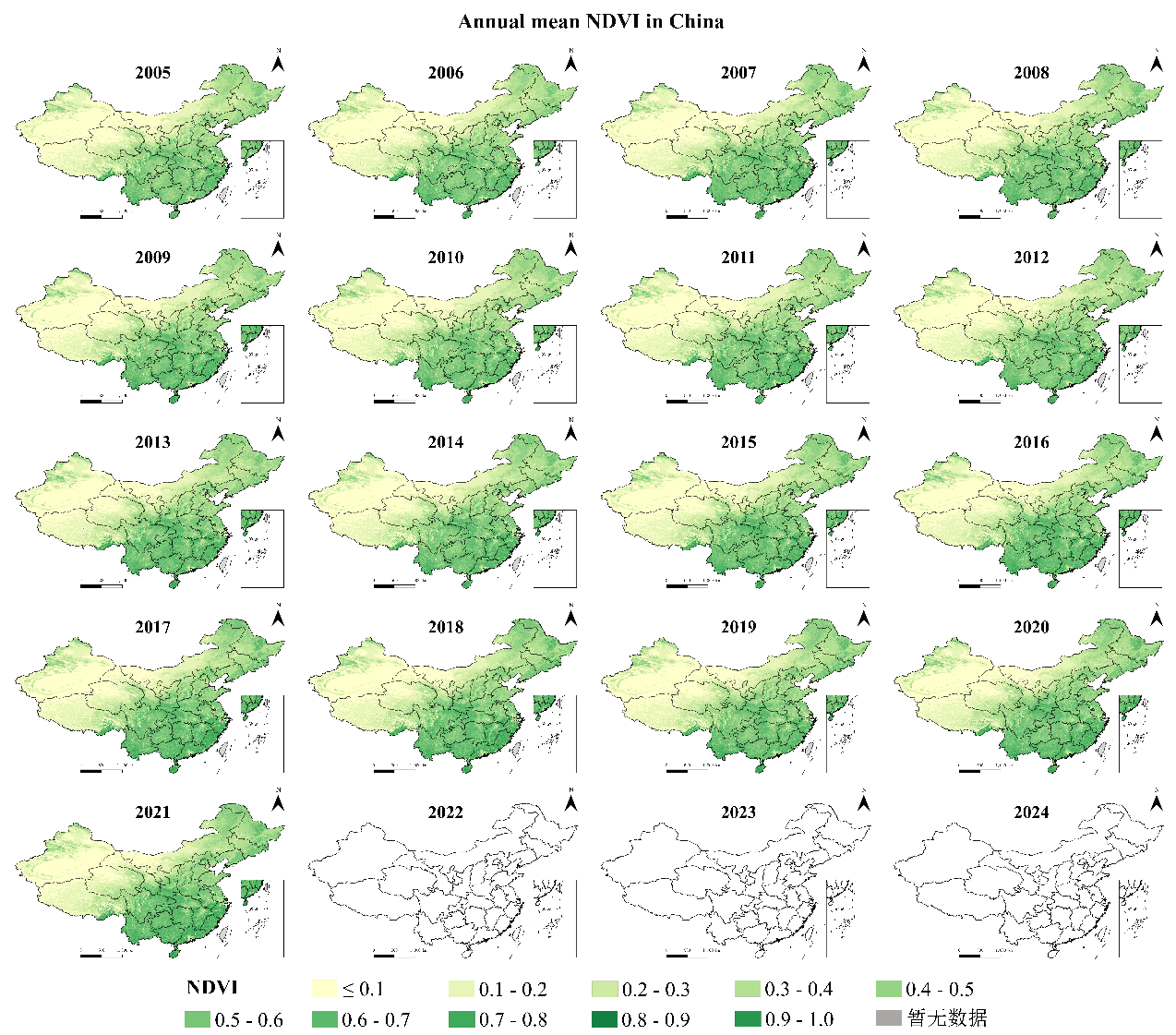该数据集包括2005-2021年中国区域年均及年最大NDVI。原始数据由搭载于 Terra 卫星上的中等分辨率成像光谱辐射计Moderate Resolution Imaging Spectroradiometer (MODIS)得到。本数据平台选择的数据产品为MOD13Q1,其空间分辨率为250m × 250m,原始数据时间分辨率为16 天。剔除云、雪和水体影响的数据,计算得到年平均NDVI和年最大NDVI数据,数据空间分辨率为250m × 250m,时间分辨率为年。NDVI 的值域在-1到1之间。正值越接近1表示植被密度越高,接近0表示裸土。负值表示水、雪(数据提取时已排除)。注意:该数据集持续更新,数据需求请发邮件联系作者(孟夏,[email protected])。